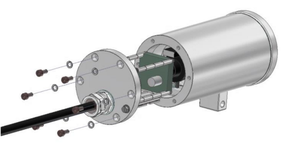 Carefully pull out the cable and supply flange to the rear, as straight as possible. Because of negative pressure, it may be difficult to remove the flange. The cylindrical clearance fit (H8f7 - DIN ISO 286) of the housing body and flange may not be tilted! Risk of damage to the flame-proof gap (DIN EN 60079-1:2012)!