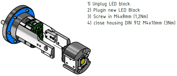 Insert the plug of the new LED replacement block into the connection socket oft he housing flange. Make sure that the plug contacts and contact surface of the aluminium heat sink are clean and undamaged. After successfully replacing the LED block, the grub screws must be tightened again. Only use new, original grub screws. Tightening torque is 1.2 Nm! Loctite 243 may be used for screw locking.